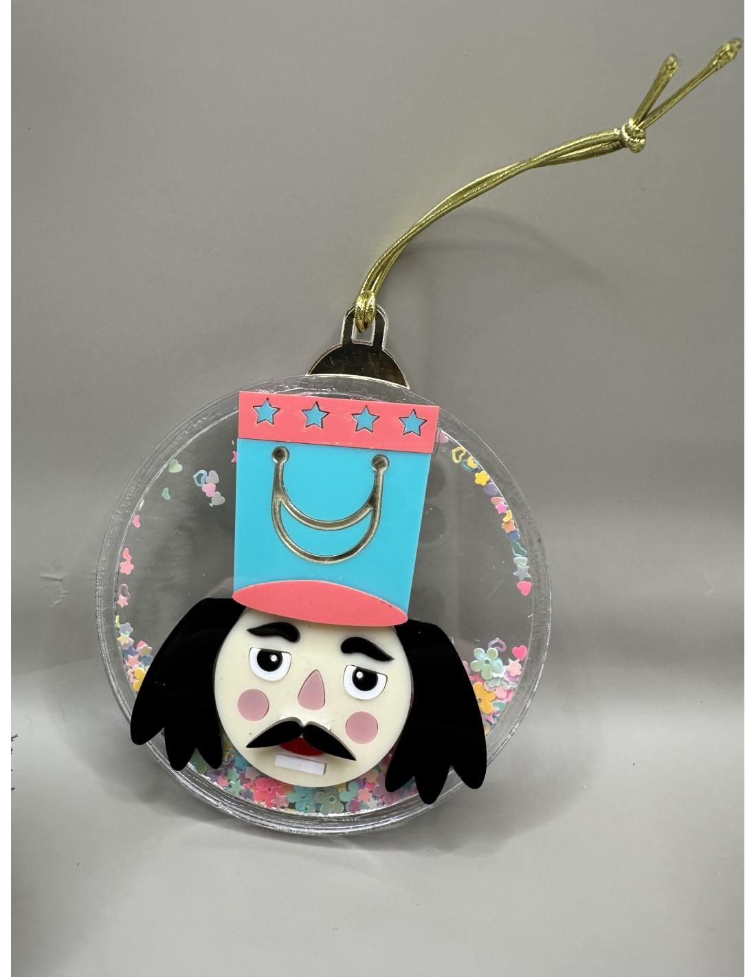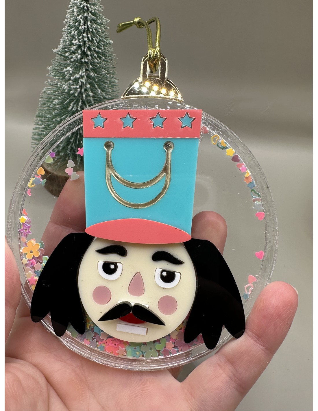 Nuestra bolita tiene una medida de 12cm x 10cm de diámetro, esta formada por tres capas de metacrilato y va rellena con purpurina en colores pasteles, para que la bola tenga movimiento. Realizada en colores pastel y personalizada.